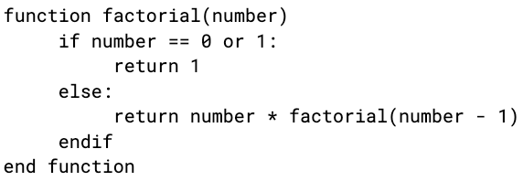 This function calculates the factorial of a number using recursion. It does this by calling itself until the terminating condition is met. A terminating condition is the condition that stops the recursion.