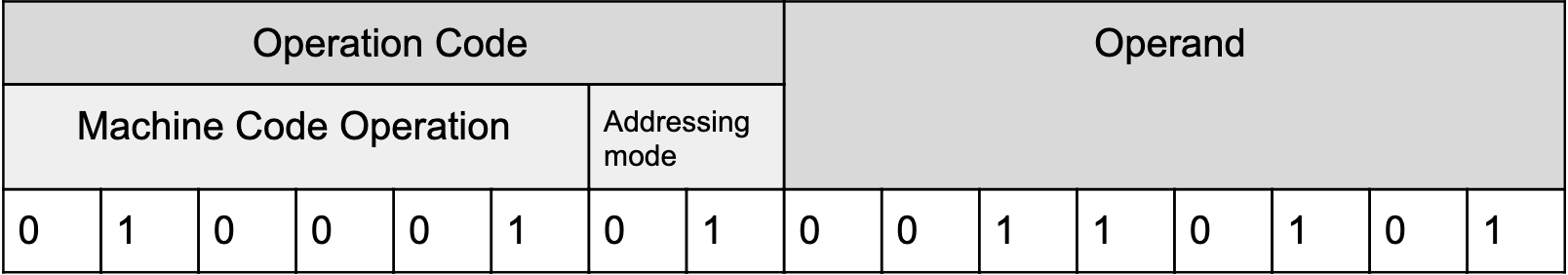 Each instruction can be split into two parts. The opcode and the operand. The opcode contains the operation — for example, fetch or add, and the operand contains the data to be operated on.